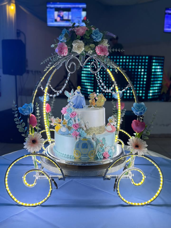 Este carruaje de cenicienta es perfecto para un solo pastel, pastel de pisos de fondant o cupcakes, cualquier postre se verá increíble, la base incluye una placa central decorada con un listón brillante,  así que no es necesario colocar nada más, además incluye  la pedrería de acrílico para darle un toque más elegante. Perfecta para cualquier evento, desde cumpleaños, XV años, 3 años o boda.