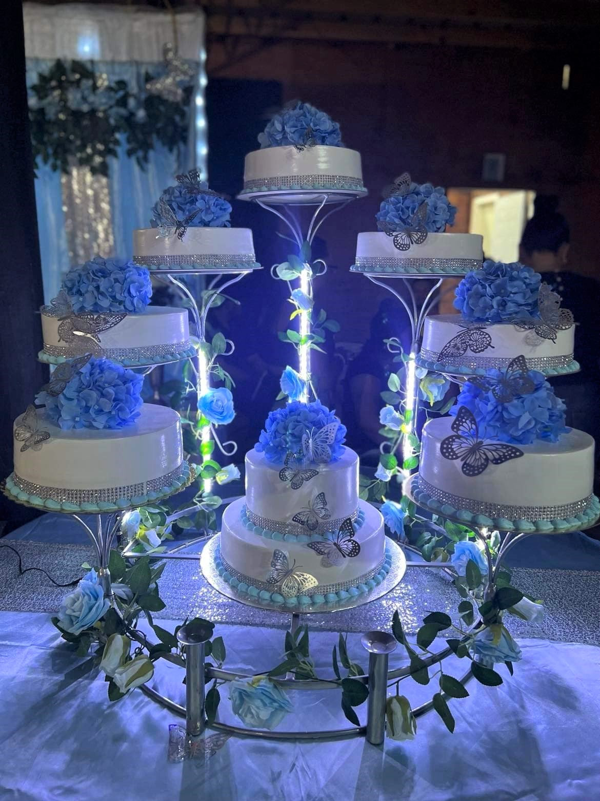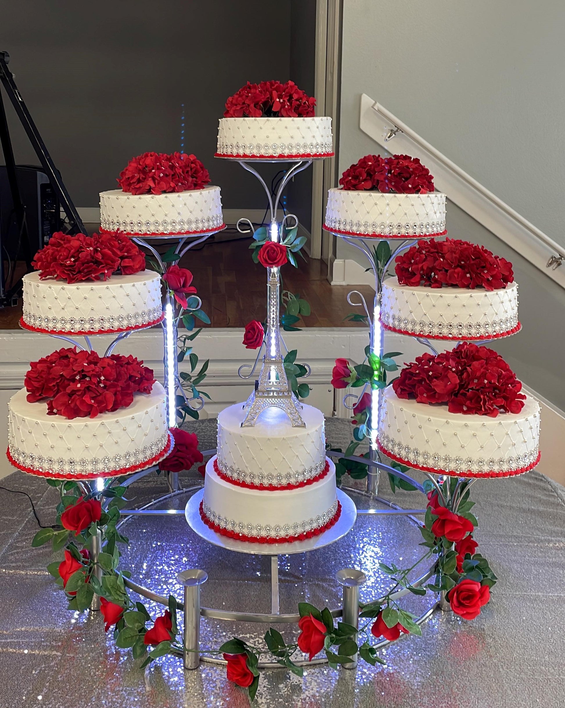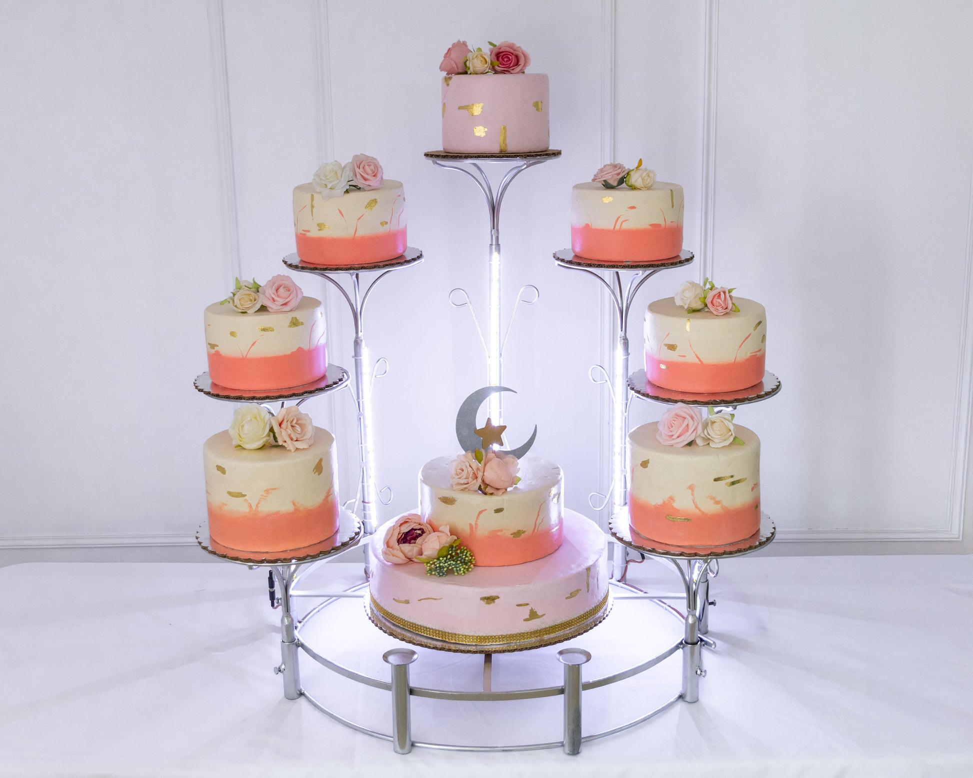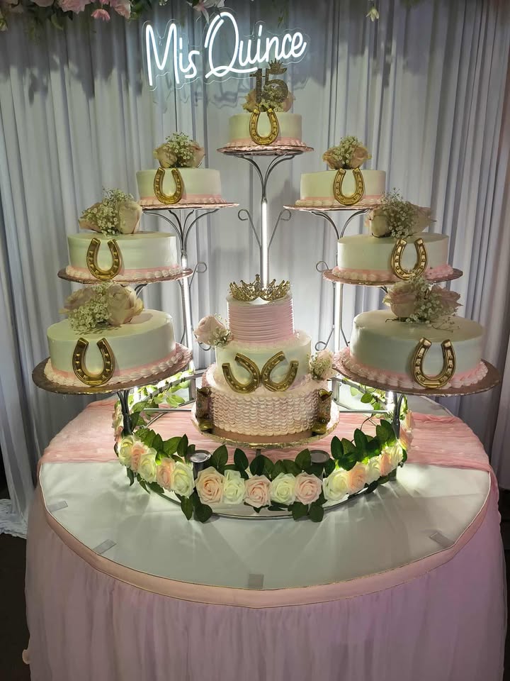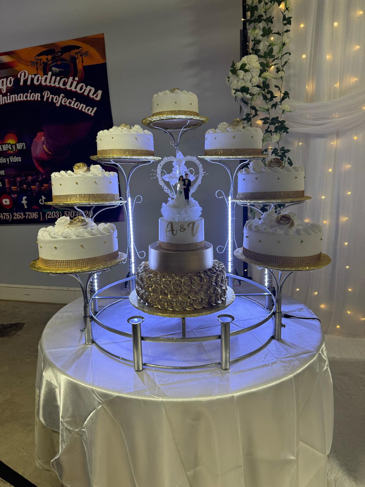 Base de acero macizo con recubrimiento de pintura electroestática color cromo de gran duración. Lista para utilizarse, cada «poste» se desarma así que es muy práctica para transportarla solo coloca tus pasteles y estarán listos para ser los protagonistas del evento. El aro central será tu gran aliado para llegar a los kilos deseados, tiene una cruz central que te permite colocar pasteles de cualquier diámetro,  si es un evento pequeño puedes colocar un pastel de un piso o no colocar nada, si es un gran evento coloca un pastel de pisos, no te preocupes por la resistencia, soporta hasta 50 kilos.