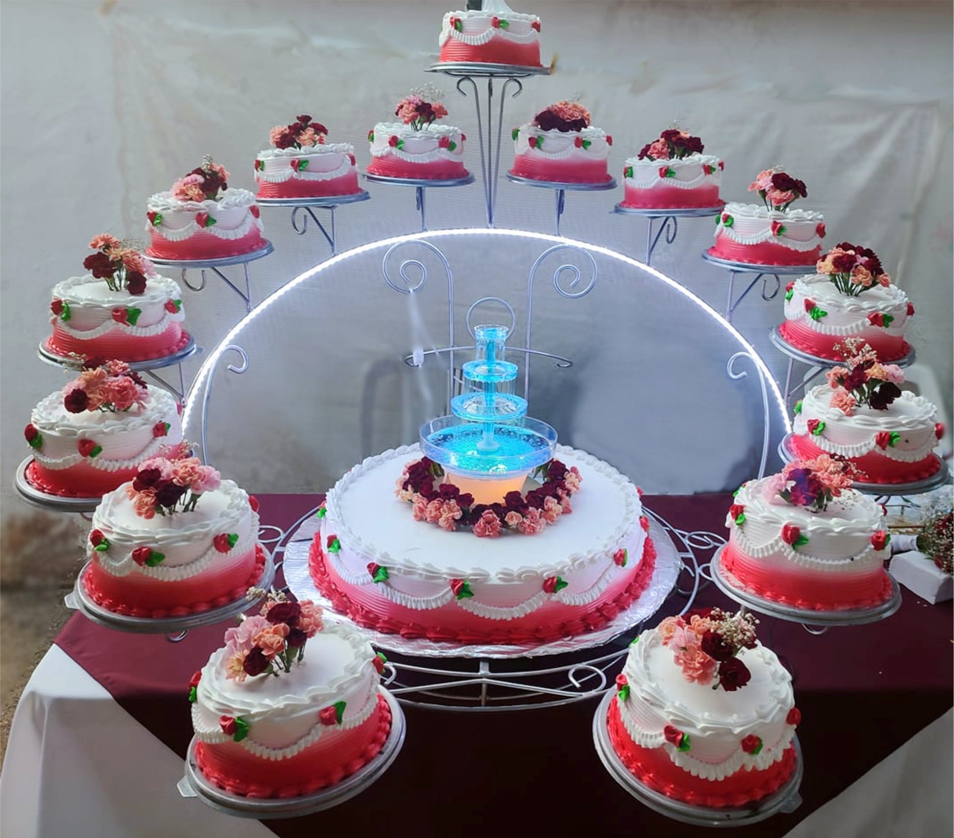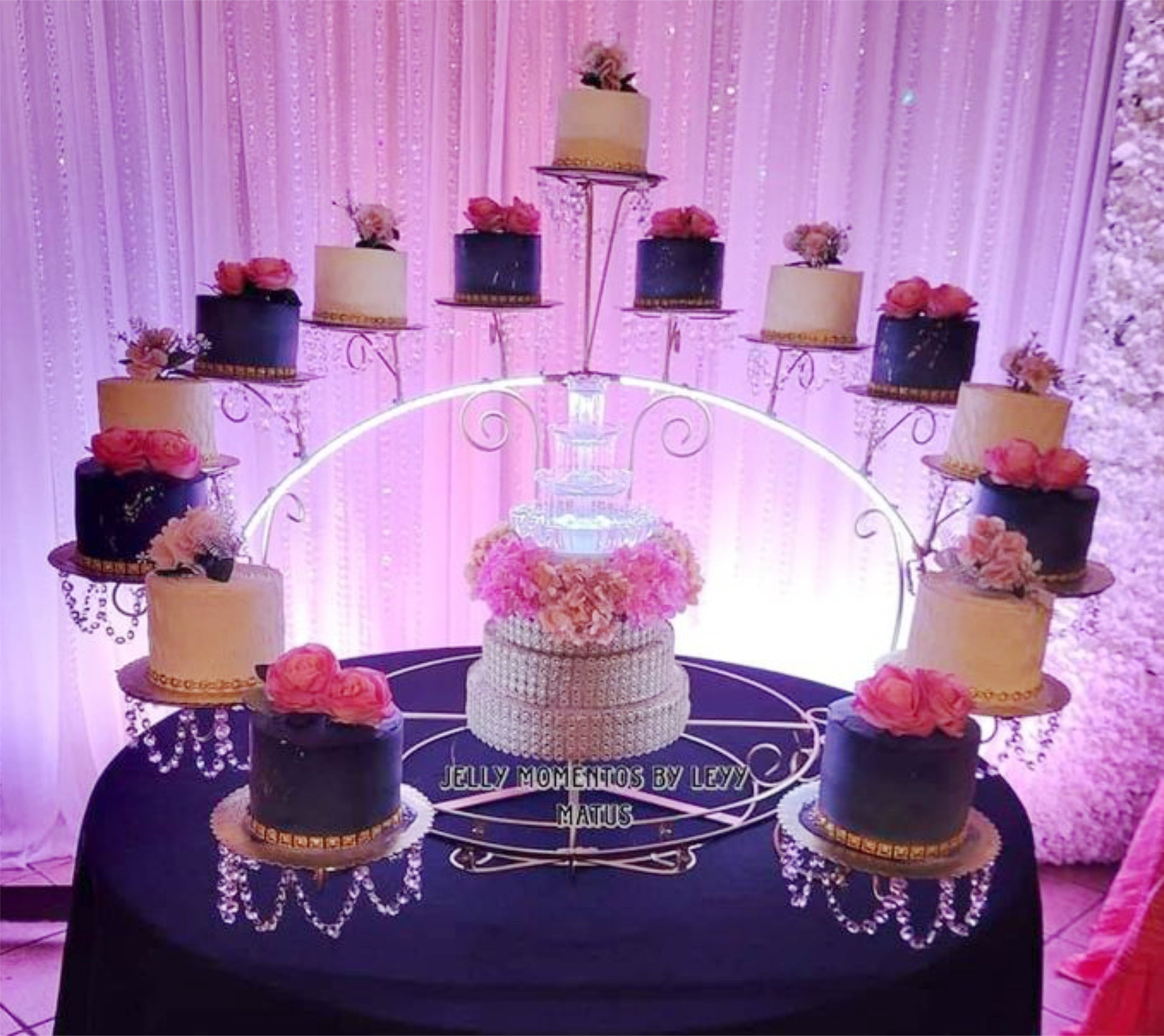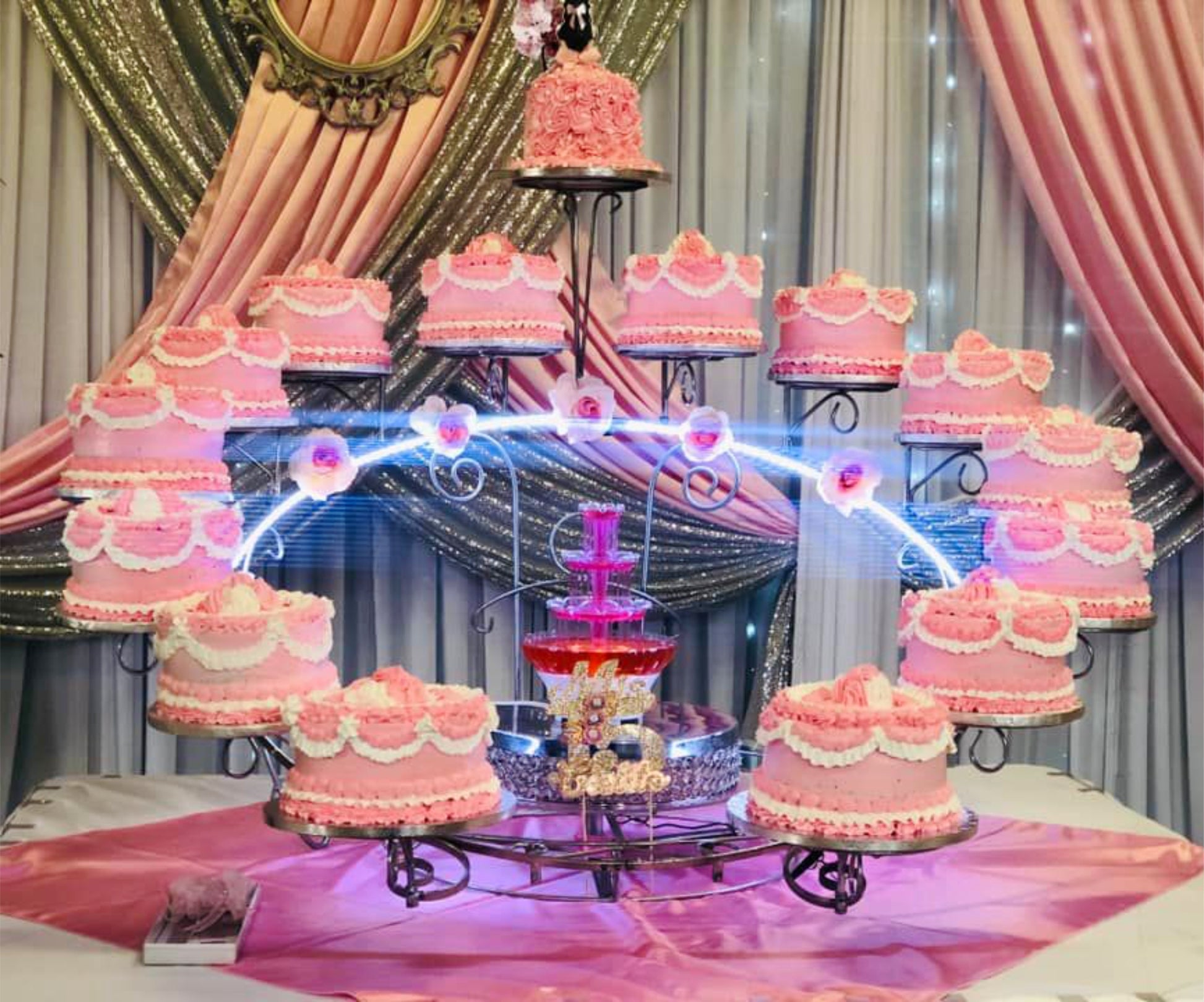 Base de acero macizo con recubrimiento de pintura electroestática. Ideal para cualquier tipo de evento el aro de bajo puede utilizarse para un gran pastel y completar los kilos deseados o bien colocar una fuente ( no incluida) o arreglos para resaltar la decoración.